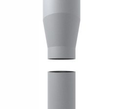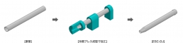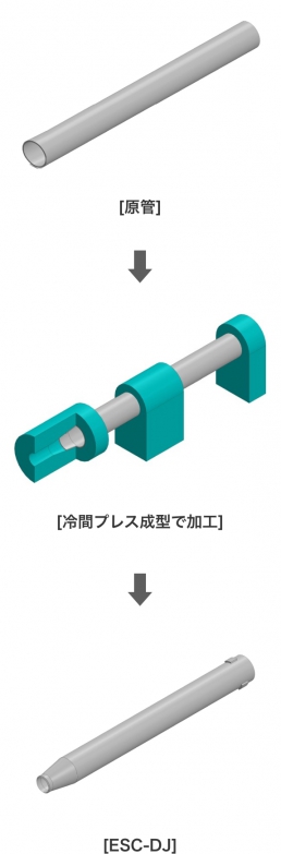 類似製品では、細径鋼管を太径鋼管に拡管するため、材厚が薄くなる傾向があります。一方、ECS-DJは太径鋼管から細径鋼管に縮管加工することで材厚を増厚でき、変断面部は原管材厚以上を確保しています。また、他社製品は溶接で接合するのに対し、ECS-DJは冷間プレス加工による一体成型のため応力集中が生じず、テーパー部は安定した品質とスムーズな応力伝達が可能になりました。