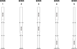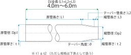 | 呼称 | 原菅径 Dp1 (mm) | 原菅 厚さ t1 (mm) | 原菅の 径厚比 ※1 | 縮菅径 Dp2 (mm) | 縮菅 厚さ t2 (mm) | 縮菅の 径厚比 ※2 | 縮菅率 (%)※3 | テーパー管 長さ L2 (mm) | 縮管 長さ L3 (mm) | テーパー管 角度 θ (° (R)) |